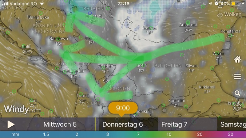 Eine gewisse Erleichterung stellte sich ein als wir aus den Tal kamen. Jedoch vor uns türmte sich schon die nächste Zelle auf. Die Nachfrage ob wir durchs Sperrgebiet fliegen dürfen wurde uns strikte abgelehnt. Also den Weg suchen und unten durch. Es klarte ein wenig auf so konnten wir um diverse kleinen Zellen herumkurven und weiter ging es koordiniert Richtung Schwarzes Meer.